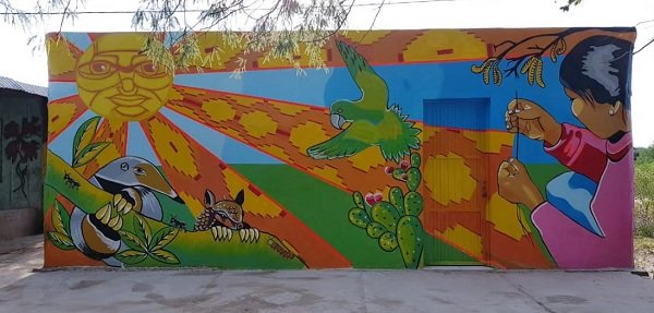 “El diseño es colectivo, porque nosotros a los talleres de arte les sumamos espacios y talleres de identidad, vamos con los jóvenes al monte, los reunimos con las ancianas, las mujeres mayores van contando cuestiones de la cultura ancestral. Ellos mismos van investigando, consultando en sus casas. Entonces, a partir de ahí, van elaborando imágenes para plasmarlas en los murales. Por ejemplo, en uno de los murales de Tres Pozos, que es una comunidad rural, vos tenés una mujer que está tejiendo una yika (bolsa confeccionada con fibras vegetales) y esa yika se convierte en los rayos del sol. también figuran animales y plantas del monte de ellos que fueron viendo a través de las recorridas. En cambio, en Lote 47, que es urbana, están algunos animalitos que conocen pero está también el molino y otras cosas que tienen más que ver con su realidad local”, explica Núñez.