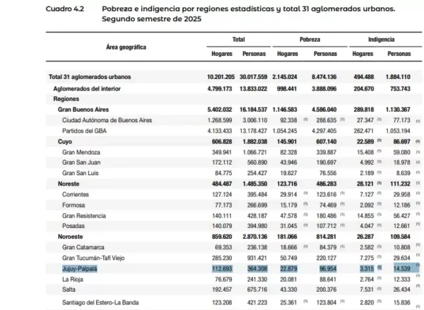 El aglomerado Jujuy-Palpalá registró una mejora drástica en sus indicadores sociales. Según el último informe del Instituto Nacional de Estadísticas y Censo (Indec) correspondiente al segundo semestre de 2025, la pobreza en la provincia cayó al 26,6%, marcando un descenso estrepitoso frente al 40% que castigaba a la región un año atrás.