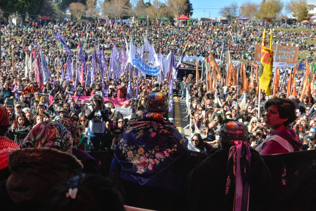 «Somos luchadoras, somos resistencia, somos territorio. Estamos acá por nuestro territorio, asumimos la defensa de ese espacio», expresó durante el acto de apertura la machi (autoridad espiritual mapuche) Betiana Colhuan Nahuel, una de las mujeres mapuche que estuvo presa luego del desalojo.