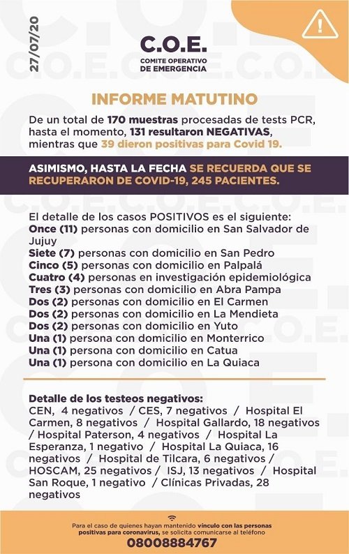En el reporte matutino de este lunes, el Comité Operativo de Emergencia registró 39 casos nuevos del Sars CoV-2 en Jujuy. De esta manera los números de contagios llegan a un total de 1667.