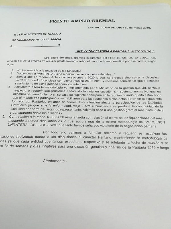 En la nota presentada por la dirigencia del Frente Amplio Gremial, reclaman que no se hizo la convocatoria a todos los gremios estatales; no convoca a paritarias, sino “a negociaciones salariales”.