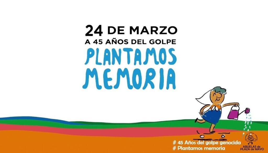 - Convocamos a la sociedad jujeña a sumarse a la iniciativa nacional “Plantamos Memoria” que consiste en plantar árboles (especies nativas), plantines, semillas, almácigos, en memoria de lxs detenidxs desaparecidxs y registrar esa acción (con fotos, videos, streaming) para subirla el 24 de marzo a las redes sociales con los tags: #45añosdelgolpegenocida #plantamosmemoria.