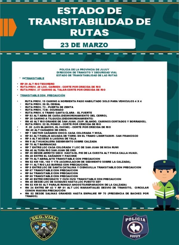 La Secretaría de Seguridad Vial actualizó este lunes el estado de las rutas en la provincia, que se encuentran intransitables por las inclemencias del tiempo que produjeron crecidas de ríos y desmoramientos de cerros.