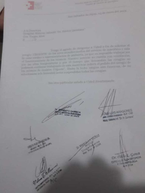 “Nuestro servicio no cuenta con ventilación, por las altas temperaturas y por el tiempo que demandan las cirugías no podemos continuar trabajando de esta manera”, y continúa, “se reitera el pedido de arreglo de los mismos (aires acondicionados) de manera urgente, Hasta la fecha ningún aire funciona, de no solucionarse a la brevedad serán suspendidas todas las cirugías”.