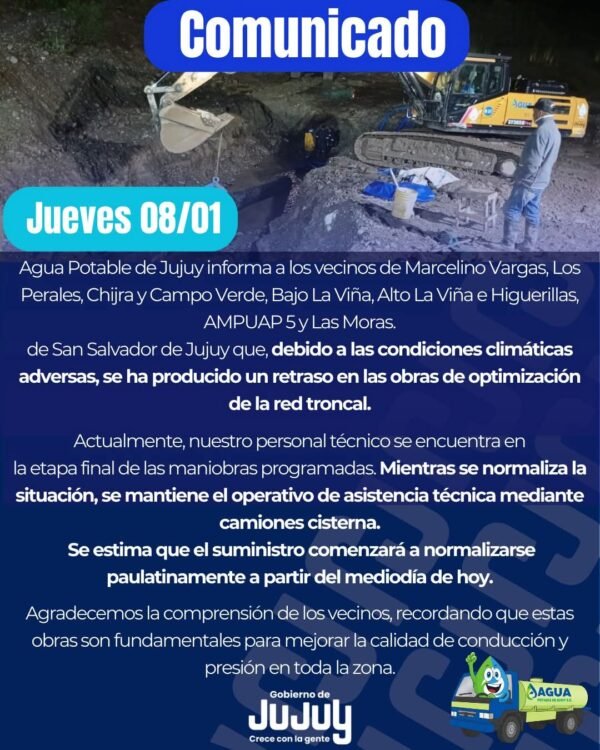 Agua Potable de Jujuy informó esta mañana a los usuarios de la zona norte y este de San Salvador de Jujuy que, debido a las condiciones climáticas adversas, se ha producido un retraso en las obras de optimización de la red troncal.