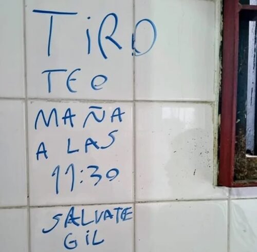 Sin embargo, el hallazgo de las réplicas coincidió con la aparición de pintadas en los sanitarios del establecimiento. A diferencia de otros casos donde los mensajes son generales, en esta institución las amenazas tienen fecha y destinatarios concretos: en el baño de varones se advirtió sobre un tiroteo para el próximo 24 de abril dirigido contra un alumno en particular, mientras que en el de mujeres apareció una frase similar mencionando a una alumna.