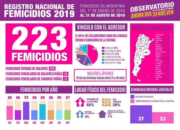 En total fueron 223 los contabilizados del 1 de enero al 31 de agosto, entre los que se incluyen 23 femicidios vinculados -de personas con relación afectiva con la mujer asesinadas para dañarla-. Además, el 79% de las víctimas tenían entre 21 y 40 años y 148 niños quedaron huérfanos.