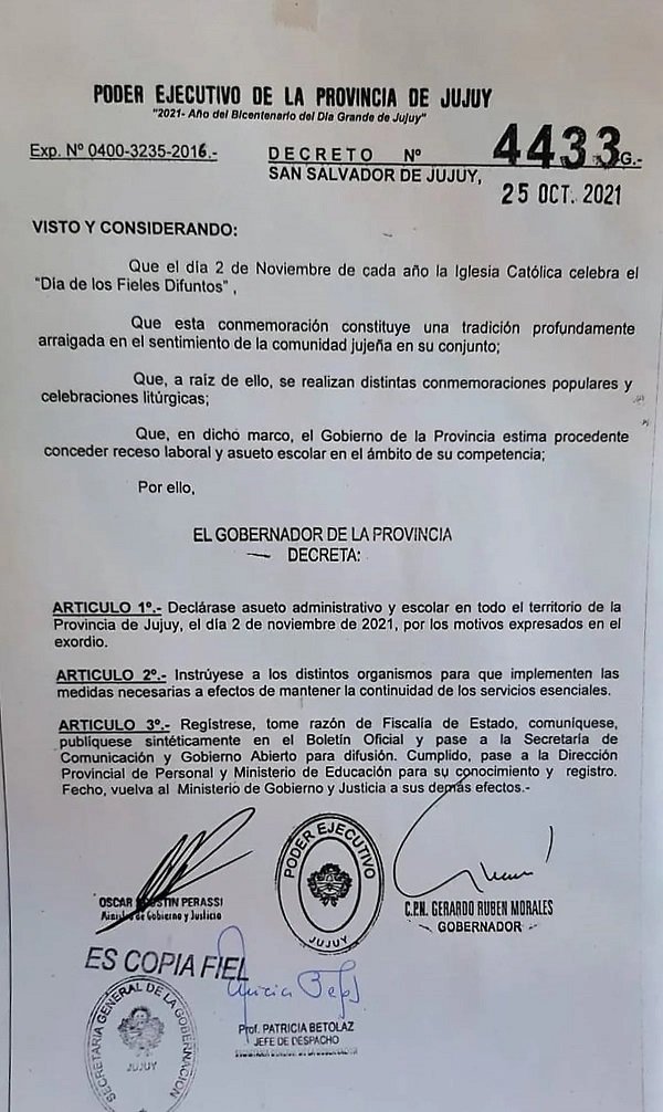El gobierno de Jujuy dispuso asueto administrativo y escolar provincial para el próximo martes, que se conmemora el día de los Fieles Difuntos. Esa jornada constituye una tradición arraigada en el pueblo jujeño.