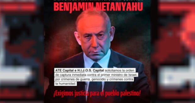 La Asociación de Trabajadores del Estado (ATE) y la organización Hijos e Hijas por la Identidad y la Justicia contra el Olvido y el Silencio (H.I.J.O.S.), denunciaron al Primer Ministro de Israel, Benjamín Netanyahu, en la Justicia y solicitaron su detención por haber cometido «crímenes de guerra y genocidio» contra Palestina.