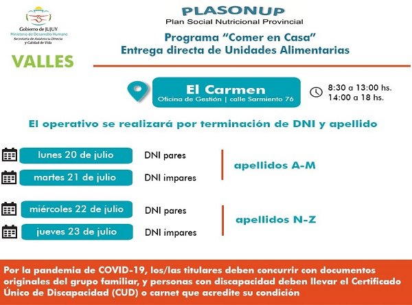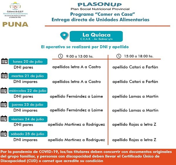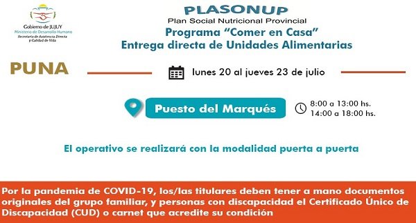 El Ministerio de Desarrollo Humano, comunicó que desde este lunes se entregarán Unidades Alimentarias correspondientes al programa “Comer en Casa” del Plan Social Nutricional Provincial (Plasonup), para beneficiarios de La Quiaca, Puesto del Marqués y El Carmen, en el marco de la emergencia sanitaria y epidemiológica por coronavirus en la provincia.