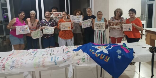 Fueron dos las banderas que se armaron con los nombres de los 145 desaparecidos de Jujuy. La primera viajó a Buenos Aires, donde se va a sumar al enorme paño que acompañará la movilización del martes. La segunda será protagonista de la vigilia de la noche del 23 en la plaza Belgrano y de la marcha que saldrá al día siguiente del Parque de la Memoria y llegará hasta el centro de la ciudad.