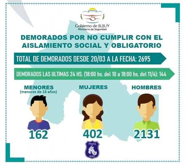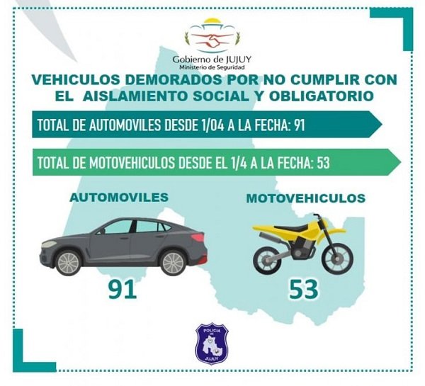 Cuando faltan horas para iniciar la tercera fase de la cuarentena, el Ministerio de Seguridad de Jujuy informó que casi 2700 personas fueron arrestadas por violar el aislamiento social preventivo obligatorio. Fueron secuestrados 144 vehículos, entre autos y motos.