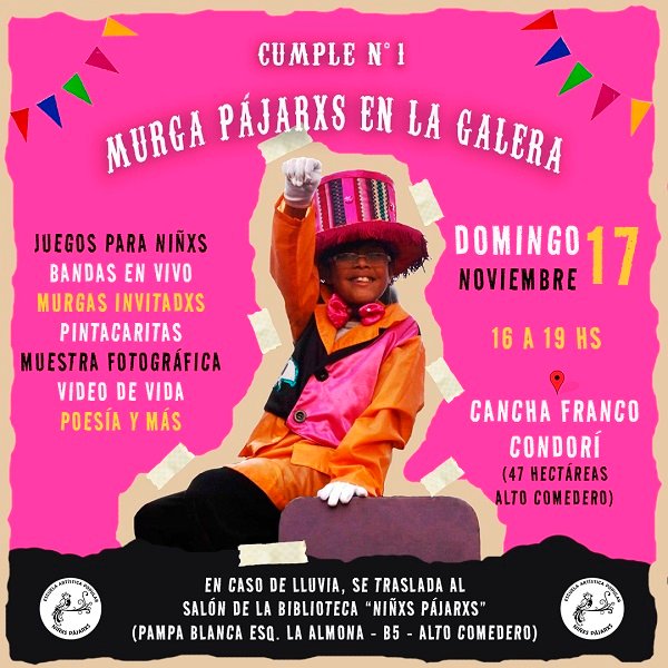 La Murga Libertaria “Pájaros en la Galera”, perteneciente a la Escuela Artística Popular “Niños Pájaros”, invita a la comunidad al festejo por su primer año de vida. La celebración se llevará a cabo este domingo desde las 16 horas en la cancha “Franco Condorí” del Barrio Obrero “Agustín Tosco” ubicado en las 47 Hectáreas de Alto Comedero.