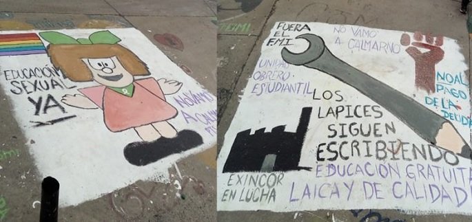 «Educación sexual ya», dice uno de los mensajes, desde una viñeta en la que se la ve a Mafalda con el pañuelo verde que representa el apoyo al aborto legal, seguro y gratuito, además de una bandera que simboliza la diversidad. En otra de las pintadas que fueron blanqueadas por orden del Ente, con la consigna «Los lápices siguen escribiendo», en referencia al aniversario de La Noche de los Lápices, se reclamaba por una «educación gratuita, laica y de calidad», se expresaba el rechazo al acuerdo con el FMI y se reivindicaba la «unión obrero-estudiantil».