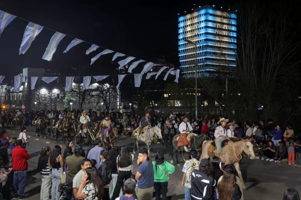 Antes del inicio de la marcha evocativa, protagonizada por centenares de gauchos, se inauguró el nuevo sistema lumínico del Palacio de Tribunales, que recrea la Bandera Nacional.