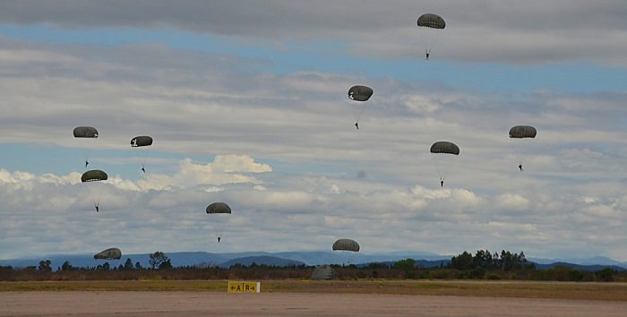 Posteriormente, el mandatario provincial se dirigió al aeropuerto local para observar junto al ministro Aguad y las fuerzas de seguridad, el ejercicio de lanzamiento en paracaídas de 120 integrantes de la Brigada de paracaidistas N° 4 de Córdoba.