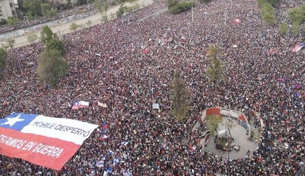 «Chile despertó. No estamos en guerra.» La consigna se lee sobre una bandera chilena inmensa que sostienen miles reunidos en la Plaza Italia de Santiago bajo la cosigna #LaMarchaMásGrande. La masiva movilización convocada por Unidad Social —que reúne a más de 70 organizaciones sociales y sindicales— corona el octavo día de protestas contra el presidente Sebastián Piñera y el modelo económico chileno en todo el país, a pesar de la renovada amenaza del toque de queda.