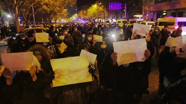 El testigo contó que una estudiante blandió una hoja en blanco -un gesto que se convirtió en una protesta simbólica contra la censura en China- y otras mujeres se unieron a ella. «Cantamos el himno y la Internacional, y gritamos ‘la libertad triunfará’, ‘no a los test’, ‘queremos comida’, ‘no al confinamiento, queremos libertad'», agregó.