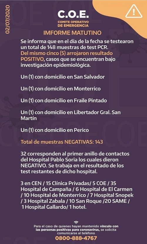 El Comité Operativo de Emergencia (COE) confirmó que se registraron cinco casos nuevos de coronavirus en Jujuy, hasta el mediodía de este jueves. Ya son 138 personas infectadas por el Sars Covid-19 en toda la provincia.
