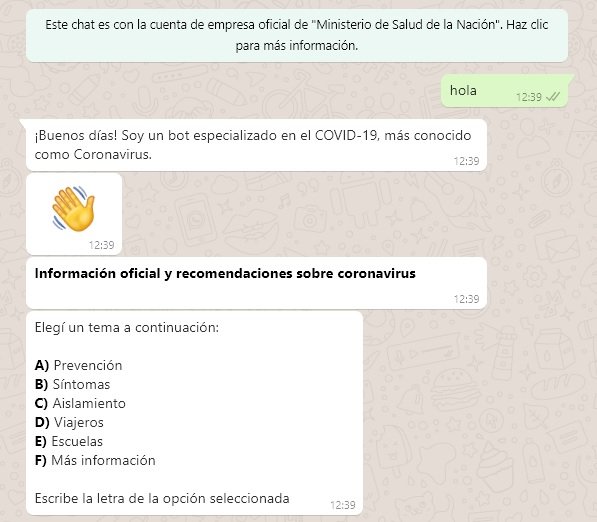 El chat de ayuda e información sobre el coronavirus fue desarrollado sobre la API empresarial de WhatsApp (WhatsApp Business API) utilizando Botmaker, uno de los principales proveedores de servicios comerciales de WhatsApp en América latina.