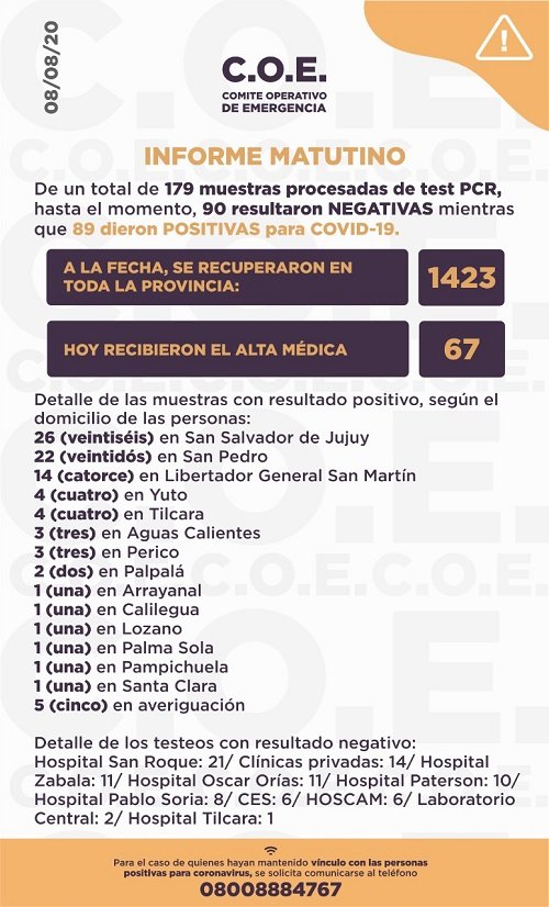 De esta forma, Jujuy alcanzó los 3.344 casos desde el inicio de la pandemia y 1.423 pacientes fueron dados de alta.