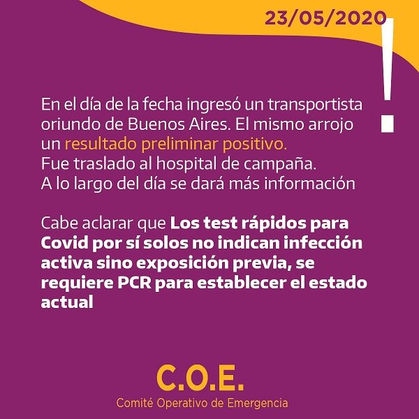Cada camionero que llega a ese lugar es sometido a un testeo rápido. En esta primera prueba, se determina si esta persona tuvo contacto o no con el virus. Como en el caso que se conocieron en los últimos días y se descartó, este trabajador del volante se realizará una nueva prueba para determinar si todavía es portador del virus o bien si ya lo superó. Venía de Buenos Aires.