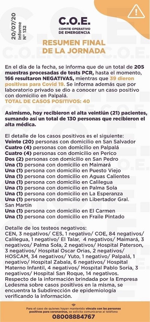 El COE informó que el grupo Ledesma comunico que hay 33 casos de Covid-19 en el ingenio, pero está verificando la misma.