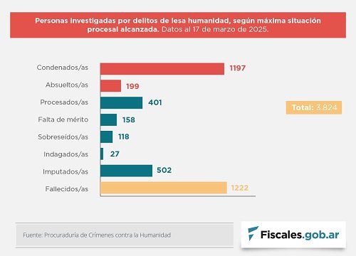 En tanto, 118 personas resultaron sobreseídas y otras 158 se vieron beneficiadas con la falta de mérito en las causas en las cuales estuvieron imputadas. «Estos datos comprueban las garantías legales que existen para las personas que están acusadas en este tipo de procesos que se siguen en Argentina en función de la anulación en 2003 de las leyes de impunidad y los indultos presidenciales de Carlos Menem», señala la Proculesa.
