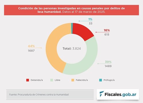 En cuanto a los imputados por los crímenes perpetrados en los tiempos del terrorismo de Estado, el informe señala que 615 se encuentran detenidos y 1489 siguen los procesos en libertad, mientras otros 33 están imputados.