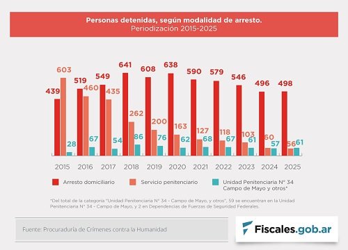 Al respecto, se remarca que, de las 615 personas privadas de su libertad, 498 gozan del beneficio del arresto domiciliario, 61 transitan su detención en unidades penitenciarias y otras 56 se encuentran alojadas en la unidad carcelaria de Campo de Mayo.