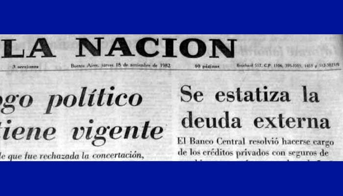 - Cuando hablamos de lo sucedido el 17 de noviembre de 1982 -fecha en la que se definió la estatización de la deuda de los grandes grupos empresarios privados-, hablamos de una de las mayores estafas al pueblo argentino, una en la que el Estado, mediante instituciones como el Banco Central, fue utilizado en beneficio del 1% de la población, a través de incontables operaciones turbias, dándole forma a prodigios tales a lograr transferir pasivos de empresas privadas en el exterior directamente a las cuentas públicas.