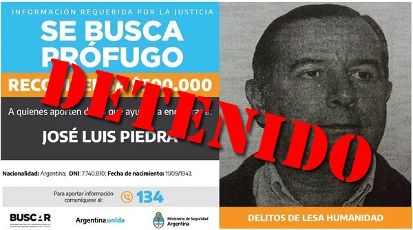 Piedra fue localizado el 7 de agosto en la casa de un familiar, donde se ocultaba desde hacía casi 12 años. Debido a su estado de salud, quedó bajo prisión domiciliaria con custodia policial, a la espera de un examen médico forense que determine si está en condiciones de ser trasladado a una unidad penitenciaria.