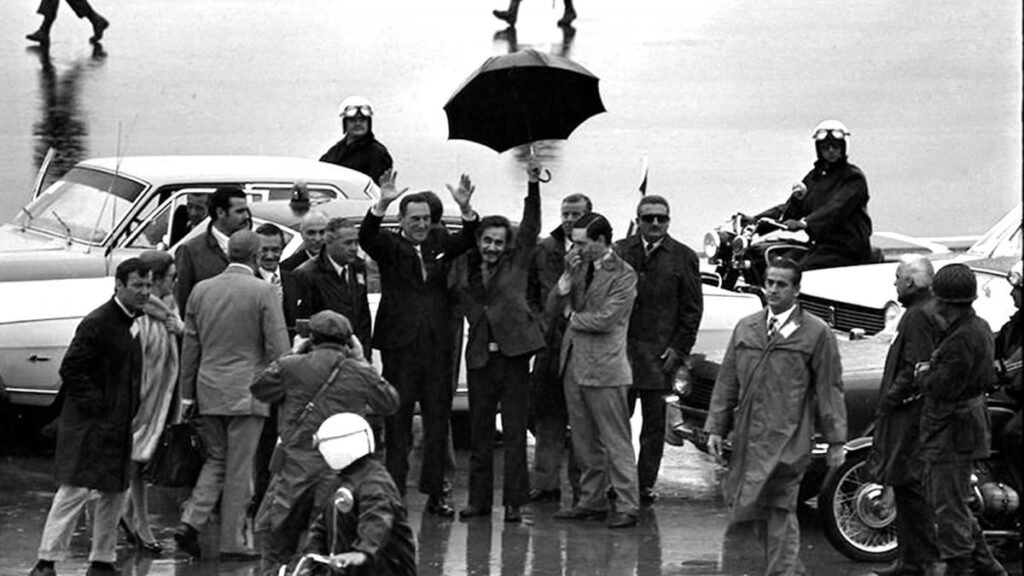 Aquella jornada de 1972, pasó a la historia la icónica imagen del secretario general del Movimiento Peronista, Juan Manuel Abal Medina, recibiendo a Perón cuando bajaba de la escalerilla del avión, y el jefe de la CGT, José Ignacio Rucci, quien lo protegió de la intensa lluvia con un paraguas.