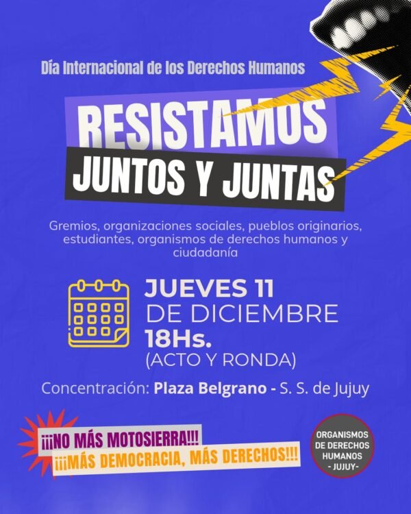 En Jujuy, se convocaron para las 18 horas en la plaza Belgrano, frente a la casa de gobierno para una nueva edición de la Marcha de la Resistencia, que desde 1981 los organismos de derechos humanos encabezan en el marco del Día Internacional de los Derechos Humanos.