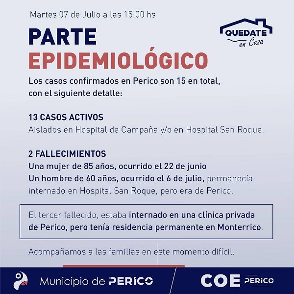 “En lo que va de la pandemia, Perico tiene en el historial de esta enfermedad tres fallecimientos y 15 casos positivos”, informó Paola Rondón, directora del Hospital Plinio Zabala de esa localidad.