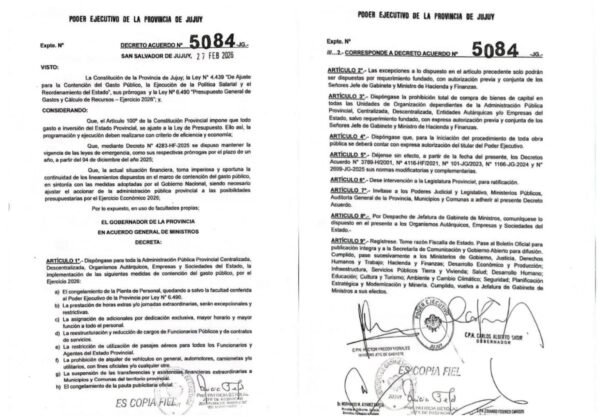 En las últimas horas comenzó a circular con fuerza el texto de un presunto Decreto Acuerdo (N° 5084) del Poder Ejecutivo provincial. El documento, que aún no fue publicado oficialmente, establece un severo plan de austeridad que impactaría en la obra pública y los fondos a municipios.