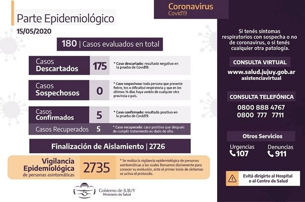 El registro histórico permanece en 5 casos positivos, todos ellos importados y recuperados. De esta manera, Jujuy sostiene su condición de provincia sin circulación viral comunitaria.