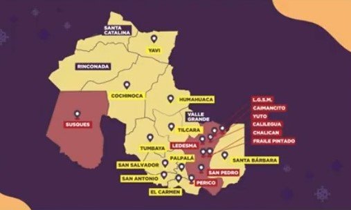 Las zonas rojas de la provincia, según el COE, son: los departamentos de Ledesma, San Pedro, Susques y la ciudad de Perico en el departamento de El Carmen, más allá que el decreto presidencial disponía que el departamento Manuel Belgrano fue declarado en aislamiento. El resto de Jujuy, se encuentra en zona amarilla.