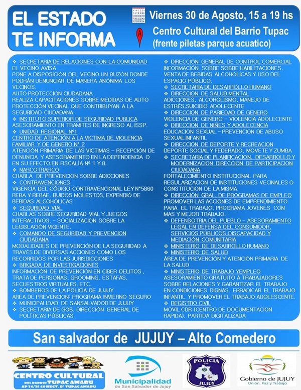 El programa “El Estado te informa” se emplazará este viernes en el Centro Cultural Tupac Amaru. Es un programa de prevención y participación ciudadana que brinda la información necesaria a través de los diferentes stands del Estado provincial y municipal.