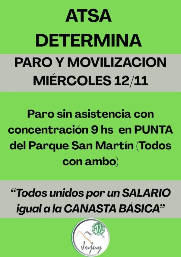 La Asociación de Trabajadores de la Sanidad Argentina (Atsa-Jujuy), realizará este miércoles un paro de 24 horas ante la necesidad que los equipos de salud puedan acceder al valor salarial de la canasta básica total.