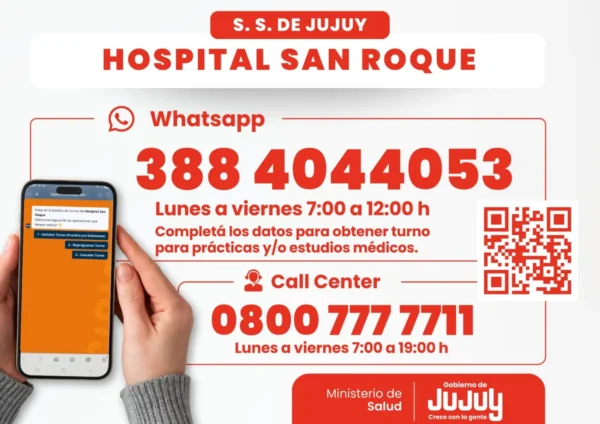 El Hospital San Roque inició la modalidad de obtener turnos por WhatsApp, desde el primer día del mes de diciembre. De manera simultánea, la gestión sigue disponible a través del Call Center de Salud 0800 777 7711, de lunes a viernes en el horario de 7 a 19 horas.