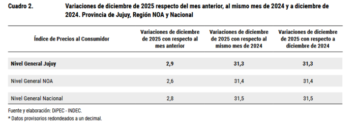 La Dirección Provincial de Estadística y Censos (Dipec) informó que la inflación en Jujuy durante el mes de diciembre de 2025 fue del 2,9%. Con este dato, la provincia cerró el año con una inflación acumulada del 31,3%, manteniéndose en línea con el promedio de la región NOA (31,4%) y el nivel general nacional (31,5%).