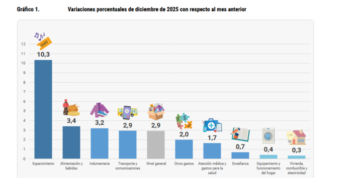 Durante el último mes del año, el rubro que lideró los aumentos fue Esparcimiento, con un salto del 10,3%, seguido por: