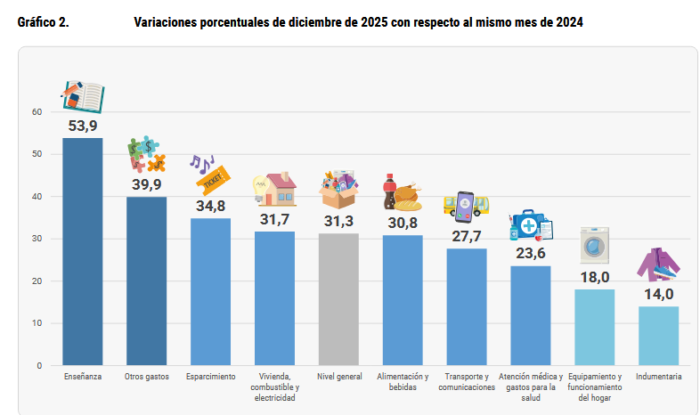 A lo largo de los doce meses, el comportamiento de los precios fue dispar. La Enseñanza encabezó las subas con un 53,9%, seguida por «Otros gastos» (39,9%) y «Esparcimiento» (34,8%).