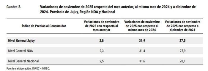 La Dirección provincial de Estadísticas y Censo (Dipec) informó esta tarde a la opinión pública que la inflación en Jujuy se aceleró y llegó al 2,8% durante el mes de noviembre.