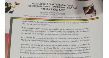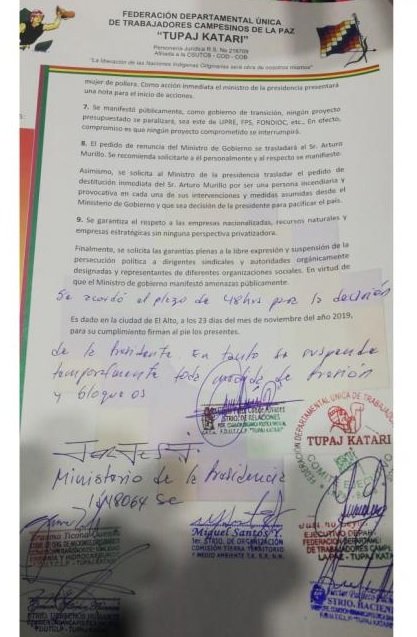 El pacto fue firmado por el ministro Justiniano en papelería de la organización Tupaj Katari, que es la Federación Departamental Unica de Trabajadores Campesinos de La Paz, junto a los representantes de las organizaciones sociales.
