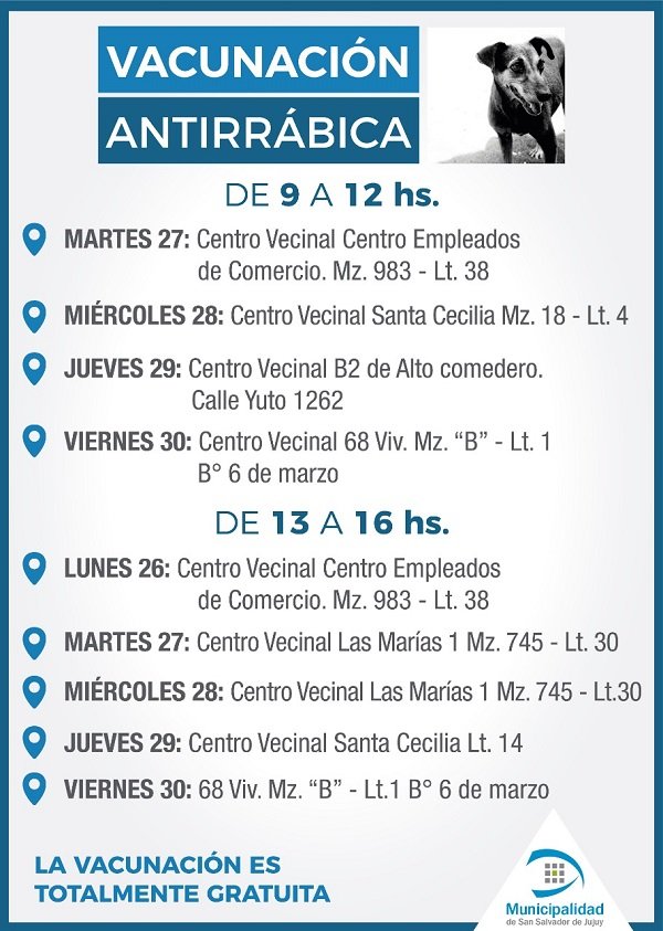 Informó que la campaña arrancó en el barrio Alto Comedero por las 30 Hectáreas y continuará a través de distintos puestos que recorrerán la ciudad y que se irán informando semanalmente por las redes sociales de la Municipalidad, “de todas maneras, podrán acercase al Centro Modelo de zoonosis, ubicado en av. Raúl Galán, anexo al mercado del barrio Santa Rosa, en la Delegación Municipal de Alto Comedero, sita en av. Forestal N°638 o en los consultorios del edificio 9 de julio, calle Oscar Orías y 9 de julio;  que estarán vacunando permanentemente”.