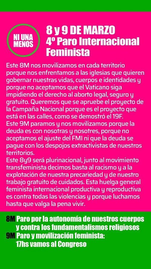“Se lanzó una convocatoria en las redes sociales y las organizaciones de mujeres y feministas, entre ellas el colectivo Ni Una Menos, se sumaron a organizar un paro de una hora y movilizaciones masivas. Esta marcha se replicó en América Latina y el Caribe”, describen desde el Paro Internacional de Mujeres (PIM), movimiento de base a cargo de la convocatoria, que reúne a más de medio centenar de países de todo el mundo.
