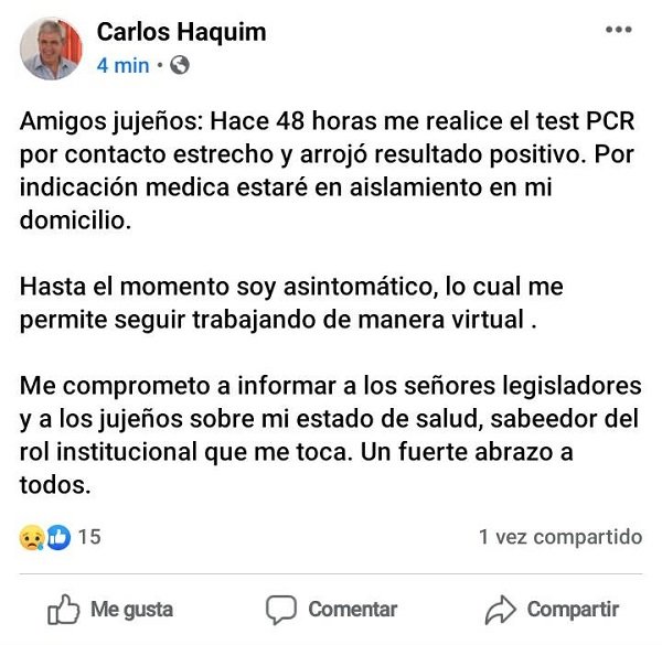 El titular del Poder Legislativo escribió: “Amigos jujeños: Hace 48 horas me realice el test PCR por contacto estrecho y arrojó resultado positivo. Por indicación médica estaré en aislamiento en mi domicilio”. Aclaró que es asintomático, “lo cual me permite seguir trabajando de manera virtual”.