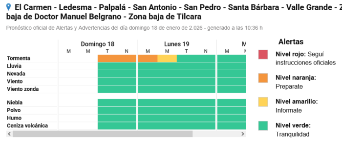 La provincia de Jujuy se encuentra bajo alerta naranja por tormentas para la madrugada de este lunes 19 de enero. La advertencia es sobre la probabilidad de lluvias intensas, con la posibilidad de actividad eléctrica y la caída de granizo y ráfagas de viento que podrían superar los 90 kilómetros por hora.